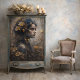 TTransform your project with Autumn Enchantress Floral Gold Blue Decoupage by Decoupage_Boutique. A whimsical portrait of a young woman crowned in autumn blooms and golden botanicals brings elegance, mystery, and fantasy charm to any piece. Ideal for romantic, fairytale, or floral-themed décor.