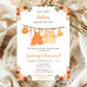 This cute and whimsical watercolor baby shower invitation features a baby clothes line with orange floral arrangements . The text combines handwritten script and sans serif fonts for a stylish and modern look. This is perfect for an autumn fall baby shower.