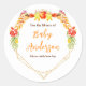 This fun and whimsical baby shower bookplate sticker features watercolor pomegranate, apples, grapes, mushrooms and foliage on a gold geometric frame. The text combines handwritten script and serif fonts for a stylish and modern look. This is perfect for a summer rustic baby shower.