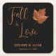 Fall In Love maple leaf rustic wedding theme beautiful square paper coasters. Country autumn themed design. Elegant and simple copper, brown, with black background dinner reception favors. Image copyright Marg Seregelyi Photography.
