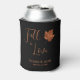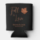 Fall In Love maple leaf rustic wedding theme beautiful beer can coolers. Country autumn themed design. Elegant and simple copper, brown, with black background dinner reception favors. Image copyright Marg Seregelyi Photography.