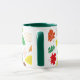 This coffee mug features a colorful autumn pattern with green, yellow, orange and brown leaves on a white background.