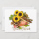Sunflowers, Indian Corn plus nuts and autumn leaves in fall colors surround a candle in this holiday arrangement. Good for invites to any late year function or party.