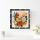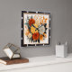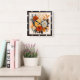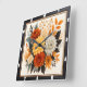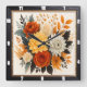 This square wall clock presents a stunning bouquet of autumn blooms in rich oranges, yellows, and creams. The arrangement features roses, dahlias, and various fall foliage, creating a beautiful and vibrant natural design. This elegant timepiece adds a touch of seasonal sophistication to any room.