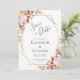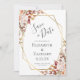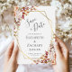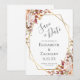 This elegant floral fall wedding save the date card features a gold geometric frame decorated with rust and peach floral bouquets on a white background. The customizable text combines charcoal gray whimsical handwriting, copperplate and italic fonts. The reverse side is solid white. Ideal for a romantic autumn wedding!