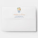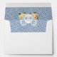 Return Address envelope design. The liner features a dark blue and white Greek Key print and a couples monogram crest, with a classic ginger jar filled with flowers in fall colors on each side. The reverse flap has the name/ return address in pumpkin orange and navy blue, complemented by the same vase with flowers that is on the liner.