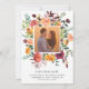 A fall-theme save the date with a beautiful floral frame. The photo save the date features watercolor flowers, including roses, buttercups, and dahlias, in pretty autumn shades of marsala, mustard yellow, peach, and plum. The watercolor floral arrangement frames your favorite photo.