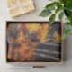 Scenic painting of a stone bridge over a flowing stream surrounded by vibrant autumn foliage.