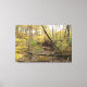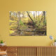 Tranquil and scenic autumn fall image of a midwest forest stream, with one fallen tree crossing the creek, and one leaning tree, creating angles. Yellow decidious leaves and brown tree trunks with sprinkles of green leaves throughout. Enjoy a scenic woods landscape all year round. Canvas wall decor art in multiple sizes.