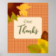 Show your appreciation for Thanksgiving, Friendsgiving, autumn, or just being grateful for the good things in life with this fun poster, perfect for adding a decorative touch for the autumn holidays. The rustic charm of the orange gingham pattern evokes the idea of a vintage picnic blanket, while the hand drawn leaves help make it feel as though you're enjoying a fall afternoon as a cool breeze sends the foliage on by.