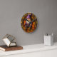 Autumn-themed wall clock featuring a whimsical purple gnome holding golden maple leaves in wooden frame. Fall decor with vibrant colors and gold numbers—perfect for cozy cabin or Thanksgiving gift.