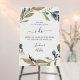 This autumn greenery night before I do rehearsal dinner foam board is perfect for a fall event. The modern rustic design features navy blue, sage green and gold leaves with sprigs of dark blue flowers.