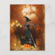 A witch in rich green dress and flowing ginger hair casting a spell against a rich autumn coloured background with cauldron, broomstick and black cat.