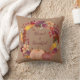 This pretty seasonal family throw pillow features the script "Blessed & Thankful" inside a colorful autumn wreath. The wreath is made of leaves, berries, and flowers, with two pumpkins at the bottom. Colors include red violet, gold, pale orange, and more. The image is placed on an autumn tan background. The back of the pillow has the same wreath image with your custom text.