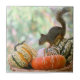 Photo of a cute squirrel standing on top of a basket full of colorful pumpkins in colors of orange, green, and white. The squirrel's tail is in the same shape as the stems of the squashes. This cute wildlife photograph is a colorful salute to the autumn harvest, Thanksgiving, and fall colors!