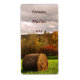 This colorful, rustic red wine bottle label presents a lovely autumn landscape in seasonal fall foliage colors of red, orange, yellow, brown and green. A storm has passed and the sun is breaking through the clouds onto a mown field with round bales of hay. All text can be customized with your special information.