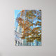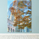 A tall modern skyscraper with glass windows stands against a clear blue sky, partially obscured by a large tree with vibrant yellow and orange autumn leaves. The tree branches extend across the image, framing the building and creating a sense of depth. A smaller, older building with arched windows and a pale pink facade is visible on the left side of the image.