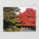 Red pine tree contrasts with a large scarlet Japanese maple over a small bridge