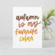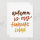 This design features the phrase "autumn is my favorite color," presented in a stylish, handwritten script. The text is arranged in a stacked, centered alignment with each word occupying its own line, creating a visually pleasing flow from top to bottom. The color palette is a gradient of warm autumn hues, transitioning from deep brown at the top for the word "autumn," to a lighter, rust orange for "is my," and finally to a vibrant yellow for "favorite color." This color transition not only reflects the rich spectrum of fall foliage but also reinforces the sentiment expressed in the phrase.
