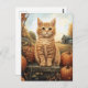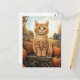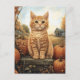Whimsical painting of a fluffy orange kitten sitting among pumpkins on a rustic farm in autumn.