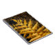 Botanical autumn leaf photograph features a golden fern frond above a dark woodland floor. The leaves are yellow with traces of warm brown. Sun highlights the fern so it stands out.