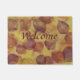 Warm and inviting doormat for the autumn season, decorated with the word, welcome, on a background of overlapping leaves in rich yellows and browns.