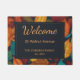 A seasonal design of leaves adorns this elegant doormat for the Fall season. The Autumn leaves are golden orange, green and blue, forming an attractive backdrop. The central section is light orange text on a deep blue background, and displays a warm 'Welcome' at the top in script typography. The mat can be personalized with your address, name(s), and date 'established' at this residence. An ideal housewarming gift and a welcoming accessory for your guests.