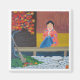 Japanese woman sewing a quilt for winter while autumn maple tree leaves fall in the courtyard