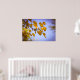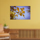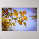 Yellow leaves on the branch of a tree viewed against the blue sky.