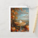 Rich autumn Thanksgiving postcard features a delectable pumpkin pie, beautifully garnished with whipped cream and surrounded by vibrant pumpkins and lush autumn leaves and delicious grapes. The natural, earthy tones and elegant composition perfectly capture the spirit of gratitude and harvest. Send warm wishes for a bountiful and joyful holiday season!