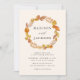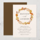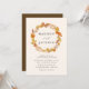 Elegant and rustic fall wedding invitations featuring a wreath of warm autumn leaves surrounding your names with your wedding details displayed below. The reverse side of the invite features a contrasting dark brown background color.