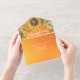 Modern Wedding Invitation with Detachable RSVP Postcard Template - Elegant Autumn Maple Leaves, Pumpkins and Sunflowers Watercolor Flowers on Orange Gradient Background.