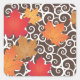 Vibrant autumn wedding favor stickers featuring a bold arrangement of red, orange, and golden maple leaves with elegant brown scrollwork on a rich dark background. The eye-catching square design makes a striking seal for favor bags, boxes, or envelopes at your fall wedding celebration. All text is fully customizable.