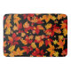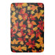 Autumn Midnight, display a vibrant pattern of autumn leaves against a black background. The leaves are a mix of bright red, orange, yellow, and gold hues, representing a variety of species like maple, oak and chestnut. `the contrast between the vivid colors of leaves and dark background creates a striking and dramatic effect, emphasizing the warm tones and intricate detail of the foliage. smaller leaves, acorns and twigs are scattered throughout, adding depth and texture to the pattern. The overall has design has an energetic and festive feel of a lively autumn night.