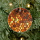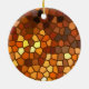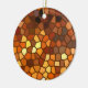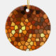 This decorative holiday ornament features a geometric abstract pattern of five sided pentagon shaped mosaic tiles in brilliant autumn colors of red, orange, brown, yellow, gold and white.