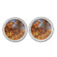 These cufflinks feature a geometric abstract pattern of five sided pentagon shaped mosaic tiles in brilliant autumn colors of red, orange, brown, yellow, gold, blue, gray, black and white.