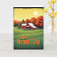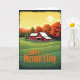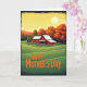 This greeting card shows a cozy countryside scene with rolling green hills leading to a red barn with a white roof and trim, set like a welcoming place to come home to ❤️. A white picket fence curves across the farmyard, as if guiding two close friends on a quiet walk toward the barn. Behind it, a band of trees mixes deep green with warm orange leaves, creating the gentle look of a season changing together. In the distance, softly shaped mountains sit under a wide golden-yellow sky, where a large glowing sun hangs low and calm. The artwork has a retro poster look with flat color areas, strong outlines, and a lightly worn texture around the border. The message “Happy Mother’s Day” sits across the lower foreground in large orange letters, standing out clearly against the landscape 🌼. Subtle shading along the hills and fence adds depth without crowding the scene. A slightly rough, speckled frame darkens the edges, giving the picture a lightly aged finish.