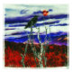 In a night sky with some clouds is a full moon that is red in color and is rising above a grouping of mountains and hills. A crow is perched on a branch of a dead Birch tree looking out onto the forest of red leafed trees.