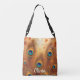 This vibrant, personalized Fall-themed tote bag features a fan of detailed peacock feathers bathed in warm sunlight, surrounded by falling maple leaves.