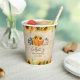 This design features three adorable pumpkins in orange, black and white plaid, and leopard print on a burlap print. Sunflowers and pumpkins encircle the edges of the cup on the top and bottom. The expectant mom's name in a handwritten cursive typography is featured along with "Baby Sprinkle" and the date.