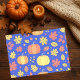 Wrap your gifts in the essence of autumn with this vibrant fall tissue paper. Set against a deep blue backdrop, the design features an inviting pattern of warm-hued pumpkins in sunny yellow and soft orange. A vibrant scatter of crimson and gold leaves, along with tiny berries and flowers, completes this festive harvest pattern, perfect for adding a touch of cozy charm to any package.