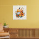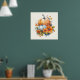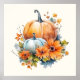 Poster with a fall themed image. Orange and white pumpkins surrounded by fall leaves and orange flowers.
