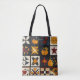 This tote bag features a quilt-inspired patchwork pattern arranged in a grid of dark and light squares. Each block highlights unique motifs, from appliquéd pumpkins, autumn leaves, and birds to geometric piecing such as stars, pinwheels, and checkerboard designs. Rendered in warm fall shades of orange, red, yellow, and brown against contrasting cream and dark blue backgrounds, it captures the cozy charm of handmade quilting. Perfect for rustic farmhouse décor, harvest season crafts, and primitive folk art enthusiasts who love autumn style.