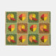 Four squares are decorated with leaves and pumpkins in fall tones of red, orange, yellow, and brown. White stitching adds a decorative touch, giving the repeating pattern the appearance of a quilt, creating a perfectly cozy feeling for autumn.