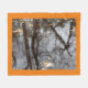 Raindrops dot the pond's surface on an autumn morning, breaking up the reflection of trees. Yellow autumn leaves float on the surface.