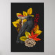 Hand-painted illustratin of a raven and autumn botanicals-leaves, mushrooms and berries