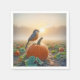 A small bird perches on a large pumpkin singing as musical notes emerge from its beak against a sunrise backdrop in a misty pumpkin field