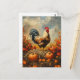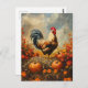 A proud autumn rooster standing among vibrant orange pumpkins and seasonal foliage.