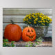 A pumpkin, jack-o-lantern and yellow mums are perfect for an autumn display.