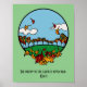 Colorful Illustration of a pleasant autumn landscape scene with soft clouds floating on a blue sky with a small hill covered in green grass and multi-colored leaves falling off the trees. Quote is from Keats and reads: The poetry of the earth is never dead.
